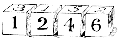יש לי סט של ארבע קוביות, שלא מסומנות עם נקודות בצורה רגילה, אלא עם ספרות ערביות, כפי שמוצג באיור. כל קובייה, כמובן, נושאת את המספרים `1` עד `6`. כאשר מצמידים אותן יחד, הן יוצרות מספרים רבים ושונים. כפי שמיוצג, הן מרכיבות את המספר `1246`. עכשיו, אם אני מרכיב את כל המספרים השונים בעלי ארבע ספרות שאפשר ליצור עם הקוביות האלה (אף פעם לא שם את אותה ספרה יותר מפעם אחת באף מספר), לסכום איזה מספר הם יגיעו? מותר לך להפוך את ה-`6` כך שייצג `9`. אני לא מבקש, או מצפה, מהקורא ללכת לכל העבודה של כתיבת הרשימה המלאה של המספרים ואז לחבר אותם. החיים לא ארוכים מספיק בשביל אנרגיה מבוזבזת כזאת. האם אתה יכול להגיע לתשובה בכל דרך אחרת?