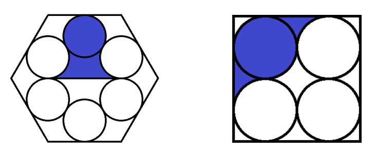 בציור השמאלי מופיע משושה, שבתוכו נמצאים 6 מעגלים בעלי רדיוס זהה. כל מעגל משיק לשני מעגלים אחרים וגם לצלע אחת של המשושה, באמצעה. מצאו את היחס בין שטח החלק הכחול לשטח החלק הלבן של המשושה.