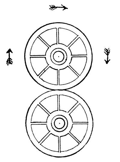 באיור המצורף יש לנו שני גלגלים. הגלגל התחתון אמור להיות קבוע והגלגל העליון מסתובב סביבו בכיוון החצים. עכשיו, כמה פעמים הגלגל העליון מסתובב סביב צירו שלו במהלך סיבוב שלם סביב הגלגל השני? אל תמהרו עם התשובה, אחרת כמעט בטוח שתטעו. נסו זאת עם שני מטבעות על השולחן והתשובה הנכונה תפתיע אתכם, כשתצליחו לראות אותה.