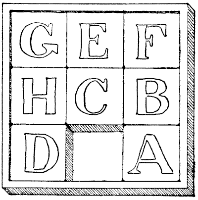 הנה תזכורת קטנה לחברנו הוותיק, פאזל חמש-עשרה הבלוקים. שמונה קוביות עץ מסומנות באותיות, וממוקמות בקופסה, כפי שמוצג באיור. ניתן לראות שאפשר להזיז רק קובייה אחת בכל פעם למקום הפנוי באותו רגע, מכיוון שאף קובייה לא יכולה להיות מורמת מהקופסה. הפאזל הוא להזיז אותן עד שמקבלים אותן בסדר הזה—