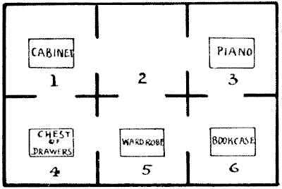 משפחת דובסון שכרה דירות בסלוקום-און-סי. היו שישה חדרים באותה קומה, כולם מחוברים, כפי שמוצג בתרשים. החדרים שהם לקחו היו מספרים `4, 5`, ו-`6`, כולם פונים לים. אבל התעוררה בעיה קטנה. מר דובסון התעקש שהפסנתר וארון הספרים יחליפו חדרים. זה היה ערמומי, כי משפחת דובסון לא הייתה מוזיקלית, אבל הם רצו למנוע מכל אחד אחר לנגן בכלי הנגינה. עכשיו, החדרים היו קטנים מאוד ופריטי הריהוט שצוינו היו גדולים מאוד, כך שלא ניתן היה להכניס שניים מהפריטים הללו לאף חדר באותו זמן. איך ניתן לבצע את ההחלפה עם מינימום עבודה? נניח, לדוגמה, שאתה מעביר תחילה את הארון לבגדים למספר `2`; אז אתה יכול להעביר את ארון הספרים למספר `5` ואת הפסנתר למספר `6`, וכן הלאה. זו חידה מרתקת, אבל לבעלת הבית היו סיבות לא להעריך אותה. נסה לפתור את הקושי שלה במספר המינימלי האפשרי של העברות עם אסימונים על דף נייר.