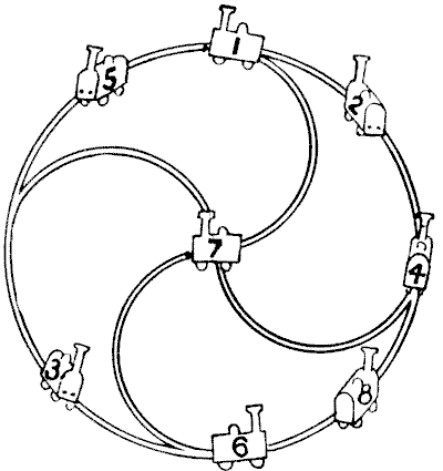 הדיאגרמה מייצגת את חצר המנועים של חברת רכבות תחת ניהול אקסצנטרי. מותר למנועים להיות נייחים רק בתשע הנקודות המצוינות, שאחת מהן פנויה כרגע. נדרש להזיז את המנועים, אחד בכל פעם, מנקודה לנקודה, בשבע עשרה מהלכים, כך שמספריהם יהיו בסדר מספרי סביב המעגל, כאשר הנקודה המרכזית נשארת פנויה. אבל אחד המנועים הוציא את האש שלו, ולכן הוא לא יכול לזוז. איך עושים את זה? ואיזה מנוע נשאר נייח לאורך כל הדרך?