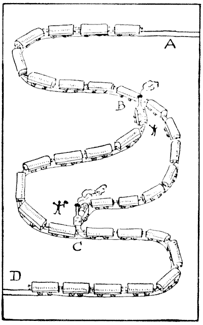 התכנית מייצגת חלק מקו הרכבת של חברת הרכבות לונדון, קלודוויל ומדפורד. זהו קו בודד עם לולאה. יש מקום רק לשמונה קרונות, או שבעה קרונות וקטר, בין B ל-C או בקו השמאלי או בקו הימני של הלולאה. קרה ששתי רכבות משא (שכל אחת מהן מורכבת מקטר ושישה עשר קרונות) נכנסו למצב המוצג באיור. זה נראה כמו מבוי סתום חסר תקווה, וכל נהג קטר רצה שהשני יחזור לתחנה הבאה ויוריד תשעה קרונות. אבל מסיק גאון לקח על עצמו להעביר את הרכבות ולשלוח אותן למסעותיהן בהתאמה, כאשר הקטרים שלהם נמצאים כראוי מלפנים. הוא גם הצליח להפוך את כיוון הקטרים במספר הפעמים המועט ביותר האפשרי. האם היית יכול לבצע את המשימה? וכמה פעמים היית צריך להפוך את כיוון הקטרים? "היפוך כיוון" פירושו שינוי כיוון, אחורה או קדימה. אסור לבצע עבודות הרמה בחבל, הרמה בתעופה או טריקים אחרים. כל העבודה חייבת להתבצע באופן לגיטימי על ידי שני הקטרים. זוהי חידה פשוטה אך מעניינת אם מנסים אותה עם אסימונים.
