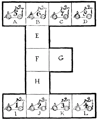 האיור מייצג את תוכנית מוסך המכוניות, עם מקום לשתים עשרה מכוניות. אבל השטח מצומצם בצורה לא נוחה, ולכן הבעלים נתקל לעתים קרובות במבוכה רבה. נניח, למשל, ששמונה המכוניות הממוספרות מ-`1` עד `8` נמצאות במקומות המוצגים, איך ניתן להזיז אותן בצורה המהירה ביותר כך ש-`1, 2, 3` ו-`4` יחליפו מקומות עם `5, 6, 7` ו-`8` — כלומר, כשהמספרים עדיין רצים משמאל לימין, כפי שהם כרגע, אבל השורה העליונה הוחלפה בשורה התחתונה? מהו המספר הקטן ביותר של מהלכים אפשריים?