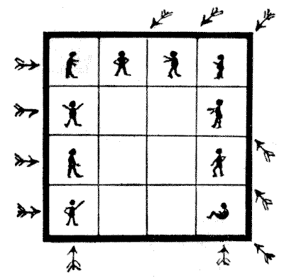 אילו לבתי הכלא לא היה שימוש אחר, עדיין ניתן היה לשמר אותם לתועלתם המיוחדת של יוצרי החידות. נראה שהם מכרה בלתי נדלה של רעיונות מבלבלים. הנה שאלה קטנה שאולי תעניין את הקורא לתקופה קצרה. באיור יש לנו כלא של שישה עשר תאים. ניתן לראות את מיקומם של עשרת האסירים. לסוהר יש אמונות תפלות מוזרות לגבי מספרים אי-זוגיים וזוגיים, והוא רוצה לסדר מחדש את עשרת האסירים כך שיהיו כמה שיותר שורות זוגיות של אנשים, אנכית, אופקית ואלכסונית. נכון לעכשיו ניתן לראות, כפי שמצוין על ידי החצים, שיש רק שתים עשרה שורות כאלה של `2` ו-`4`. אני אצהיר מיד שהמספר הגדול ביותר של שורות כאלה שאפשר הוא שש עשרה. אבל הסוהר מרשה להעביר רק ארבעה אנשים לתאים אחרים, ומודיע לי, שכיוון שהאיש שיושב בפינה הימנית התחתונה חולה, אסור להזיז אותו. עכשיו, איך נשיג את שש עשרה השורות האלה של מספרים זוגיים בתנאים כאלה?