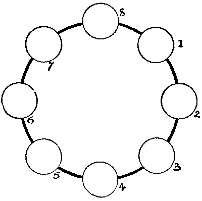 הנה חידה שלדעתי תהיה משעשעת כמו שהיא מלמדת. נתון לנו מעגל של שמונה עיגולים. כאשר עיגול `8` ריק, עלינו לכתוב את שמה של עיר נמל בת שבע אותיות בממלכה המאוחדת באופן הזה. געו בעיגול ריק עם העיפרון שלכם, ואז קפצו מעל שני עיגולים בכל כיוון מסביב למעגל, וכתבו את האות הראשונה. לאחר מכן געו בעיגול ריק אחר, קפצו מעל שני עיגולים, וכתבו את האות השנייה. המשיכו באופן דומה עם שאר האותיות בסדר הנכון שלהן עד שתשלימו את המילה. לדוגמה, נניח שנבחר ב-"Glasgow," ונמשיך כדלקמן: `6`—`1, 7`—`2, 8`—`3, 7`—`4, 8`—`5`, מה שאומר שאנחנו נוגעים ב-`6`, קופצים מעל `7`, וכותבים "G" על `1`; לאחר מכן נוגעים ב-`7`, קופצים מעל `8` ו-`1`, וכותבים "l" על `2`; וכן הלאה. יתברר שאחרי שכתבנו את חמש האותיות הראשונות - "Glasg" - כמו לעיל, אנחנו לא יכולים להמשיך הלאה. או שיש משהו לא בסדר עם "Glasgow," או שלא הצלחנו לבצע את הקפיצות שלנו כראוי. האם תוכלו לרדת לשורש התעלומה?