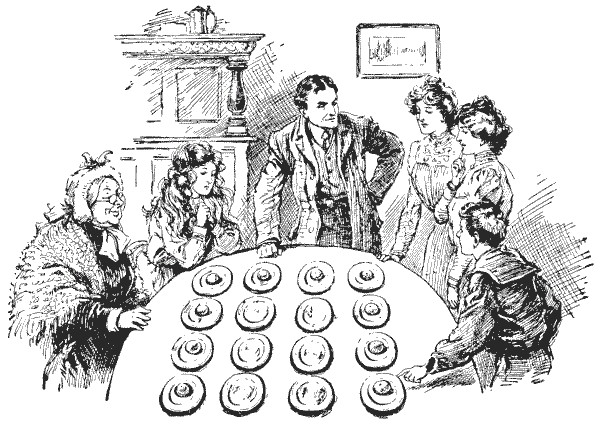 הכומר הנכבד לקח דף נייר וחילק אותו לעשרים וחמישה ריבועים, כמו חלק מרובע של לוח שחמט. אחר כך הניח תשעה שקדים על הריבועים המרכזיים, כפי שמוצג באיור, שם ייצגנו דלפקים ממוספרים לנוחיות במתן הפתרון.