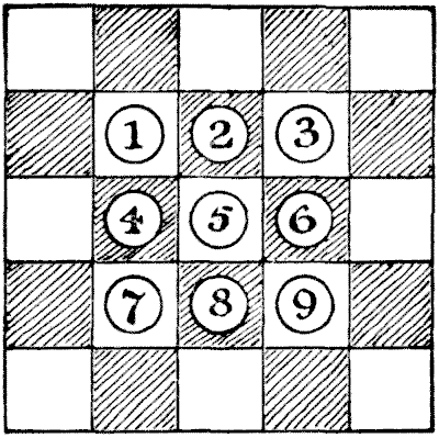 הנה ההתחלה של פתרון דמיוני שישמש כדי להבהיר לחלוטין את אופן התנועה, ולהראות כיצד הפותר צריך לכתוב את ניסיונותיו: `5-17`, `12-10`, `26-12`, `24-26` (`13-11`, `11-25`), `9-11` (`26-24`, `24-10`, `10-12`), וכו', וכו'. הקפיצות הכלולות בסוגריים נחשבות למהלך אחד, מכיוון שהן נעשות עם אותו אסימון. מצא את המספר המועט ביותר של מהלכים אפשריים. כמובן שאסורות קפיצות אלכסוניות; אתה יכול לקפוץ רק בכיוון הקווים.
