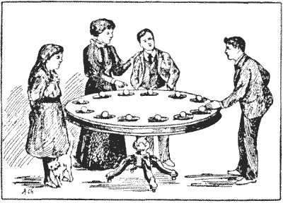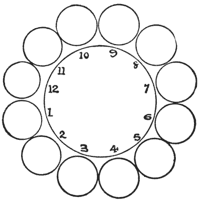 הנה חידה נחמדה וקטנה הדורשת רק שנים-עשר פני או אסימונים. סדרו אותם במעגל, כפי שמוצג באיור. כעת הרימו פני אחד בכל פעם, והעבירו אותו מעל שני פני, והניחו אותו על הפני השלישי. לאחר מכן הרימו פני בודד נוסף ועשו את אותו הדבר, וכן הלאה, עד שבשישה מהלכים כאלה, יהיו לכם המטבעות בשישה זוגות בעמדות `1, 2, 3, 4, 5, 6`. אתם יכולים לנוע בכל כיוון סביב המעגל בכל מהלך, וזה לא משנה אם השניים שקפצתם מעליהם מופרדים או זוג. זה די קל אם אתם משתמשים רק במעט מחשבה.