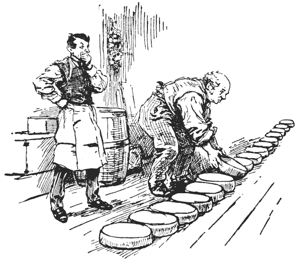 מוכר הגבינות המתואר באיור הוא חובב חידות מושבע. אחת החידות האהובות עליו היא ערימת גבינות במחסן שלו, שעשוע שהוא מוצא בו פעילות גופנית טובה כמו גם תרגול מחשבתי. הוא מניח שש עשרה גבינות על הרצפה בשורה ישרה ואז הופך אותן לארבע ערימות, עם ארבע גבינות בכל ערימה, על ידי העברת גבינה מעל ארבע אחרות. אם תשתמשו בשש עשרה אסימונים ותמספרו אותם בסדר מ-`1` עד `16`, תוכלו להניח את `1` על `6, 11` את `7` על `4`, וכן הלאה, עד שיהיו ארבעה בכל ערימה. ניתן לראות שזה לא משנה אם ארבעת אלה שמעבירים מעליהם עומדים לבד או בערימה; הם נספרים בדיוק אותו הדבר, ותמיד אפשר לשאת גבינה לכל כיוון. ישנן דרכים רבות ושונות לעשות זאת בשנים עשר מהלכים, כך שזה הופך למשחק טוב של "סבלנות" לנסות לפתור אותו כך שארבע הערימות יישארו במקומות מותנים שונים. לדוגמה, נסו להשאיר את הערימות בקצוות הקיצוניים של השורה, במספרים `1, 2, 15` ו-`16`; זה די קל. אחר כך נסו להשאיר שלוש ערימות יחד, במספרים `13, 14`, ו-`15`. שוב, שחקו כך שהן יישארו במספרים `3, 5, 12`, ו-`14`.
