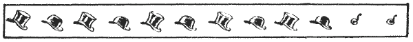 עשרה כובעים נתלו על יתדות כפי שמוצג באיור—חמישה כובעי משי וחמישה כובעי לבד, "בולרים," לסירוגין משי ולבד. שתי היתדות בקצה השורה היו ריקות.