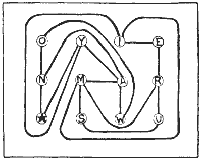 שני רוכבי אופניים התייעצו במפת דרכים לקראת טיול קצר משותף. העיגולים מייצגים ערים, וכל הדרכים הטובות מיוצגות על ידי קווים. הם מתחילים מהעיר עם הכוכב, ועליהם להשלים את הטיול שלהם ב-E. אבל לפני שהם מגיעים לשם הם רוצים לבקר בכל עיר אחרת פעם אחת, ורק פעם אחת. זו הבעיה. מר ספייסר אמר, "אני בטוח שנוכל למצוא דרך לעשות זאת;" אבל מר מגס השיב, "בשום אופן, אני בטוח." עכשיו, מי מהם צדק? קחו את העיפרון שלכם ובדקו אם תוכלו למצוא דרך לעשות זאת. כמובן שעליכם להישאר בדרכים המצוינות.