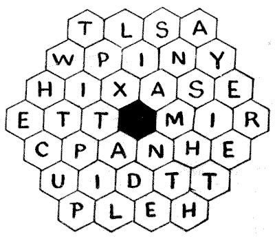 הנה חידה קטנה עם התנאים הפשוטים ביותר האפשריים. הניחו את חוד העיפרון שלכם על אות באחד התאים של חלת הדבש, ועקבו אחר פתגם מוכר מאוד על ידי מעבר תמיד מתא לתא הסמוך לו. אם תבחרו בדרך הנכונה, תבקרו בכל תא פעם אחת בלבד. החידה קלה בהרבה ממה שהיא נראית.