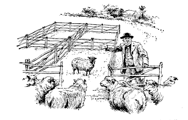 החקלאי השלישי אמר, "יש לי ארבע מכלאות גדר בשדה שלי, ועדר קטן של כבשים מסורסים, אז אם רק תרד איתי למטה אני אראה לך איך זה נעשה." האיור מתאר את ידידי כשהוא עומד להדגים לי את העניין. ההסבר הבהיר שלו היה כנראה זה שהיה במוחו של כותב המאמר באנציקלופדיה. מה זה היה? האם אתה יכול להניח את חמש עשרה הכבשים האלה?