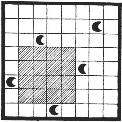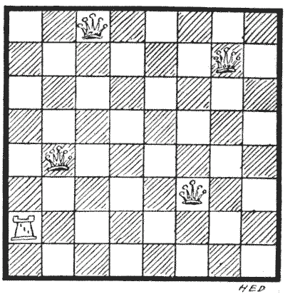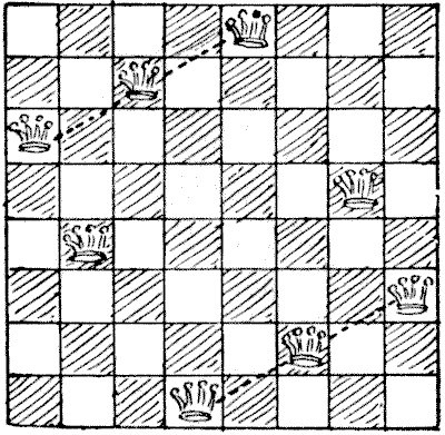 המלכה היא ללא ספק הכלי החזק ביותר על לוח השחמט. אם תניח אותה על אחד מארבעת הריבועים במרכז הלוח, היא תוקפת לא פחות מעשרים ושבעה ריבועים אחרים; ואם תנסה להחביא אותה בפינה, היא עדיין תתקוף עשרים ואחד ריבועים. ניתן להניח שמונה מלכות על הלוח כך שאף מלכה לא תתקוף מלכה אחרת, וזוהי חידה ותיקה (שהועלתה לראשונה על ידי נאוק ב-`1850`, ויש לה ספרות משלה) לגלות בכמה דרכים שונות ניתן לעשות זאת. אני מראה דרך אחת בתרשים, ויש בסך הכל שתים עשרה דרכים שונות במהותן. שנים עשר אלה מניבים תשעים ושתיים דרכים אם אנו רואים היפוכים ושיקופים כשונים. התרשים הוא במידה מסוימת סידור סימטרי. אם תהפוך את הדף, הוא ישחזר את עצמו בדיוק; אבל אם תסתכל עליו כשאחד הצדדים האחרים בתחתית, תקבל דרך אחרת שאינה זהה. ואז אם תשקף את שתי הדרכים האלה במראה, תקבל עוד שתי דרכים. כעת, כל אחד-עשר הפתרונות האחרים אינם סימטריים, ולכן ניתן להציג כל אחד מהם בשמונה דרכים על ידי היפוכים ושיקופים אלה. כך יובן מדוע שנים עשר הפתרונות השונים במהותם מניבים רק תשעים ושניים סידורים, כפי שאמרתי, ולא תשעים וששה, כפי שהיה קורה אילו כל שנים עשר לא היו סימטריים. כדאי שתהיה הבנה ברורה בעניין ההיפוכים והשיקופים כאשר עוסקים בחידות על לוח השחמט.