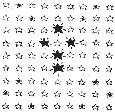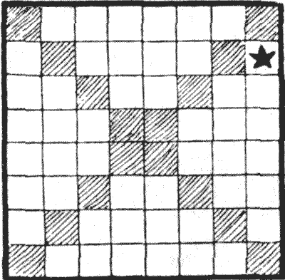 החידה במקרה הזה היא למקם שמונה כוכבים בדיאגרמה כך שאף כוכב לא יהיה באותו קו עם כוכב אחר אופקית, אנכית או אלכסונית. כוכב אחד כבר ממוקם, ואסור להזיז אותו, כך שנשארו רק שבעה לקורא למקם. אבל אסור למקם כוכב על אף אחד מהריבועים המוצללים. יש רק דרך אחת לפתור את החידה הקטנה הזו.