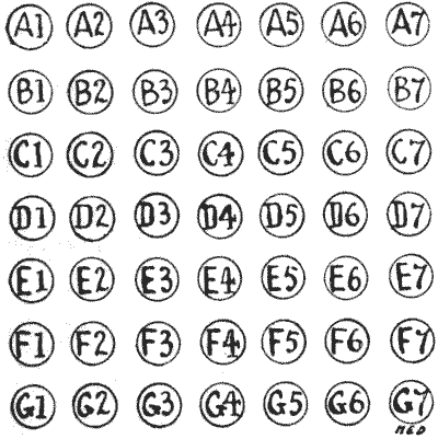 האם תוכלו לסדר מחדש את ארבעים ותשעה האסימונים שלמעלה בריבוע כך שאף אות, וגם אף מספר, לא יהיו באותו קו עם אחד דומה, אנכית, אופקית או אלכסונית? כאן אני, כמובן, מתכוון לקווים המקבילים לאלכסונים, במובן של לוח השחמט.