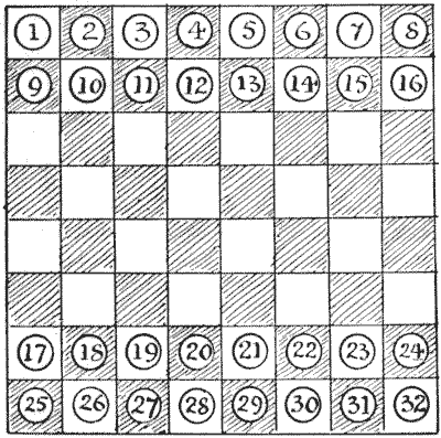 הנה הרחבה של משחק הסוליטר האחרון. כל מה שאתם צריכים זה לוח שחמט ושלושים ושניים כלים, או אותו מספר של דמקה או חיילים. באיור נעשה שימוש בחיילים ממוספרים. החידה היא להסיר את כל החיילים חוץ משניים, ושני אלה חייבים להיות במקור באותו צד של הלוח; כלומר, שני הנותרים חייבים להיות שייכים לקבוצה `1` עד `16` או לקבוצה השנייה, `17` עד `32`. מסירים חייל על ידי קפיצה מעליו עם חייל אחר למשבצת הבאה מעבר לו, אם המשבצת הזו פנויה, אבל אי אפשר לבצע קפיצה בכיוון אלכסוני. המהלכים הבאים יבהירו את המשחק: `3-11`, `4-12`, `3-4`, `13-3`. כאן `3` קופץ מעל `11`, ואתם מסירים את `11`; `4` קופץ מעל `12`, ואתם מסירים את `12`; וכן הלאה. יתגלה שזהו משחק סבלנות קטן ומרתק, והפתרון דורש הפעלת תושייה מסוימת.