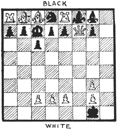 בערב חג מולד אחד נסעתי ברכבת למקום קטן באחד המחוזות הדרומיים. התא היה מלא מאוד, והנוסעים היו דחוסים מאוד. השכן שלי באחד ממושבי הפינה למד בקפידה עמדה שהוצבה על אחד מלוחות השחמט המתקפלים הקטנים שאפשר לשאת בנוחות בכיס, ובקושי יכולתי להימנע מלהסתכל בו בעצמי. הנה העמדה:—