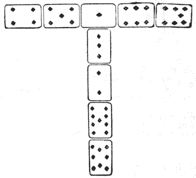 חידה משעשעת עם קלפים היא לקחת את תשעת הקלפים מסדרה אחת, מאס ועד תשע כולל, ולסדר אותם בצורת האות "T," כפי שמוצג באיור, כך שהנקודות בשורה האופקית יספרו אותו דבר כמו אלו בעמודה. בדוגמה הנתונה הם מסתכמים לעשרים ושלוש בשני הכיוונים. עכשיו, זה די קל להשיג סידור נכון יחיד. החידה היא לגלות בכמה דרכים שונות ניתן לעשות זאת. למרות שהמספר גבוה, הפתרון לא באמת קשה אם נתקוף את החידה בצורה הנכונה. את הדרך ההפוכה המתקבלת על ידי שיקוף האיור במראה לא נספור כשונה, אך כל שאר השינויים במיקומים היחסיים של הקלפים ייספרו כאן. כמה דרכים שונות יש?