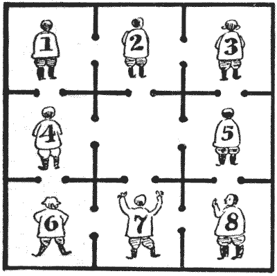 האיור מציג תוכנית של בית סוהר המכיל תשעה תאים, כולם מקושרים זה לזה באמצעות פתחי דלתות. לשמונת האסירים יש מספרים על גבם, ומותר לכל אחד מהם להתעמל בכל תא שמתפנה, בכפוף לכלל שבאף זמן נתון לא יהיו שני אסירים באותו תא. המלך העליז שבתחום שלטונו היה ממוקם בית הסוהר הציע להם נוחיות מיוחדות בערב חג המולד אחד, אם, מבלי להפר את הכלל הזה, הם יוכלו למקם את עצמם כך שמספריהם ייצרו ריבוע קסם.