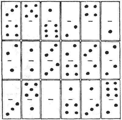 האיור מציג שמונה עשרה אבני דומינו המסודרות בצורת ריבוע, כך שמספר הנקודות בכל אחד מששת הטורים, שש השורות ושני האלכסונים הארוכים מסתכם ל-`13`. זהו הסכום הקטן ביותר האפשרי עם מבחר כלשהו של אבני דומינו מקופסה רגילה של עשרים ושמונה. הסכום הגדול ביותר האפשרי הוא `23`, ופתרון למספר זה ניתן להשיג בקלות על ידי החלפת כל מספר במשלים שלו ל-`6`. לכן, עבור כל ריבוע ריק, החליפו `6`, עבור כל `1` החליפו `5`, עבור כל `2` החליפו `4`, עבור `3` החליפו `3`, עבור `4` החליפו `2`, עבור `5` החליפו `1`, ועבור `6` החליפו ריבוע ריק. אבל החידה היא לבצע בחירה של שמונה עשרה אבני דומינו ולסדר אותן (בדיוק בצורה המוצגת) כך שהסכומים יהיו `18` בכל ארבעה עשר הכיוונים שהוזכרו.