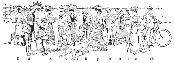 כעת, מכיוון שידידי היה אמן, ומכיוון שחשבתי שאפשר להמציא חידה משעשעת על פי קווי השאלה שלו, ביקשתי ממנו להכין לי ציור לפי כמה הנחיות שנתתי לו, ויש לי תענוג להציג את התוצרת שלו לקוראים שלי. ניתן לראות שהתמונה מציגה שישה גברים ושש נשים: מס' `1, 3, 5, 7, 9` ו-`11` הן נשים, ומס' `2, 4, 6, 8, 10` ו-`12` הם גברים. שנים עשר האנשים האלה מייצגים שישה זוגות נשואים, שכולם זרים זה לזה, אשר, בהליכה חסרת מטרה, התערבבו. אבל אנחנו עוסקים רק באיש שחובש כובע קש—מספר `10`. החידה היא למצוא את אשת האיש הזה. בחנו את שש הנשים בקפידה, ובדקו אם תוכלו לקבוע מי מהן.