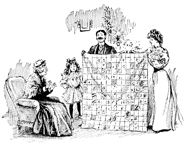 הבעת ההנאה של גברת סמיילי הייתה כנה כאשר שש נכדותיה שלחו לה, כמתנה לחג המולד, שמיכת טלאים יפה מאוד, שהן הכינו במו ידיהן. היא נבנתה מחתיכות מרובעות של חומר משי, כולן באותו גודל, ומכיוון שהן הכינו שמיכה גדולה עם ארבעה עשר ריבועים קטנים אלה בכל צד, ברור שנתפרו לתוכה בדיוק `196` חתיכות. עכשיו, שש הנכדות תרמו כל אחת חלק מהעבודה בצורה של ריבוע מושלם (כל ששת החלקים בגודל שונה), אך כדי לחבר אותם ליצירת השמיכה המרובעת היה צורך לפרום את עבודתה של ילדה אחת לשלושה חלקים נפרדים. האם תוכלו להראות כיצד ניתן היה לבצע את החיבורים? כמובן, שאף חלק לא ניתן להפוך.