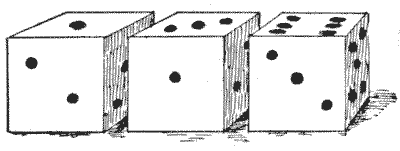 הנה טריק קטן ונחמד עם שלוש קוביות. אני מבקש ממך לזרוק את הקוביות מבלי שאראה אותן. לאחר מכן אני אומר לך להכפיל את הנקודות של הקוביה הראשונה ב-`2` ולהוסיף `5`; ואז להכפיל את התוצאה ב-`5` ולהוסיף את הנקודות של הקוביה השנייה; ואז להכפיל את התוצאה ב-`10` ולהוסיף את הנקודות של הקוביה השלישית. לאחר מכן אתה נותן לי את הסכום הכולל, ואני יכול מיד לומר לך את הנקודות שנזרקו בשלוש הקוביות. איך אני עושה את זה? לדוגמה, אם זרקת `1, 3`, ו-`6`, כפי שמוצג באיור, התוצאה שהיית נותן לי תהיה `386`, שממנה אוכל מיד לומר מה זרקת.