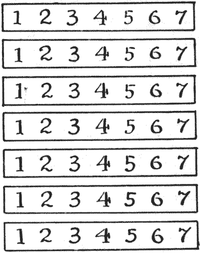קחו שבע רצועות קרטון והניחו אותן יחד כפי שמוצג לעיל. לאחר מכן כתבו על כל אחת מהן את המספרים `1, 2, 3, 4, 5, 6, 7`, כפי שמוצג, כך שהמספרים ייצרו שבע שורות ושבע עמודות.