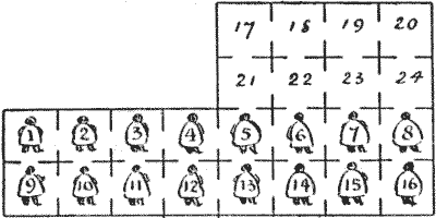 החידה הבאה תמחיש את החשיבות של היכולת לקבוע את הגבולות המינימליים והמקסימליים של מספר נדרש. לעתים קרובות ניתן לעשות זאת. לדוגמה, טרם התברר בכמה דרכים שונות ניתן לבצע את מסע הפרש על לוח השחמט; אבל אנו יודעים שזה פחות ממספר הצירופים של `168` דברים שנלקחו `63` בכל פעם ויותר מ-`31,054,144`—כי האחרון הוא מספר המסלולים מסוג מסוים. או, כדי לקחת מקרה מוכר יותר, אם תשאל אדם כמה מטבעות יש לו בכיס, הוא עשוי לומר לך שאין לו מושג קלוש. אבל בחקירה נוספת תוציא ממנו הצהרה כגון: "כן, אני בטוח שיש לי יותר משלושה מטבעות, ובאותה מידה בטוח שאין כל כך הרבה כמו עשרים וחמישה." כעת, הידיעה שמספר מסוים נמצא בין `2` ל-`12` בחידה שלי תאפשר לפותר למצוא את התשובה המדויקת; ללא מידע זה יהיה מספר אינסופי של תשובות, מהן לא ניתן יהיה לבחור את הנכונה.