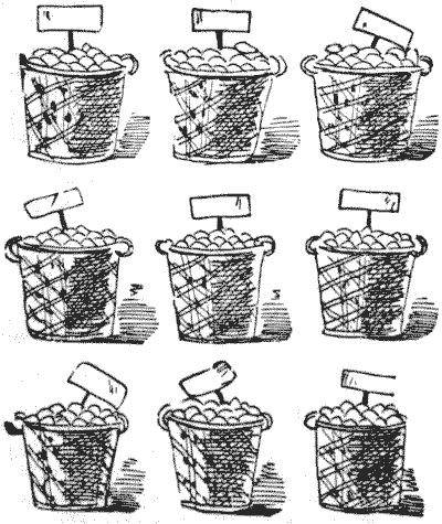 לסוחר פירות היו תשעה סלים. כל סל הכיל שזיפים (כולם שלמים ובשלים), והמספר בכל סל היה שונה. כאשר הם הוצבו כפי שמוצג באיור, הם יצרו ריבוע קסם, כך שאם הוא היה לוקח כל שלושה סלים בקו בשמונה הכיוונים האפשריים, תמיד יהיה אותו מספר של שזיפים. החלק הזה של הפאזל קל מספיק להבנה. אבל מה שבא לאחר מכן נראה ממבט ראשון קצת מוזר.