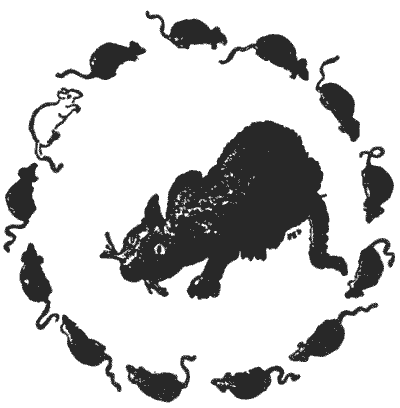 "כן, אני מכיר את החוקים," אמר החתול. "אני צריך להסתובב במעגל, בכיוון שבו אתם מסתכלים, ולאכול כל עכבר שלושה-עשר, אבל אני חייב לשמור את העכבר הלבן לפינוק בסוף. שלושה עשר הוא מספר חסר מזל, אבל אעשה כמיטב יכולתי להיענות לבקשתכם."