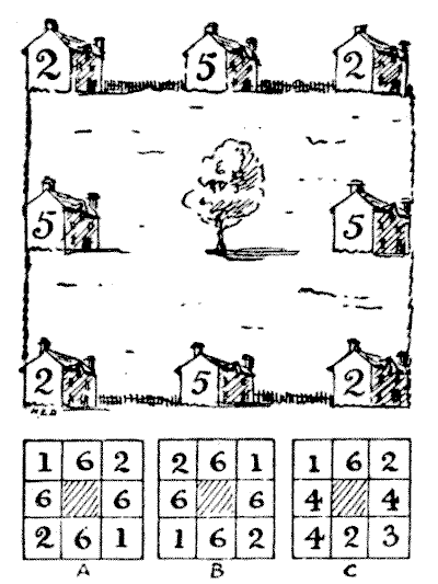 באחד מפרבריה החיצוניים של לונדון היה לאיש חלקה מרובעת שעליה החליט לבנות שמונה וילות, כפי שמוצג באיור, עם שטח משחקים משותף באמצע. לאחר שהבתים הושלמו, וכולם או חלקם הושכרו, הוא גילה שמספר הדיירים בשלושת הבתים המרכיבים צד של הריבוע היה בכל מקרה תשעה. הוא לא ציין כיצד הדיירים התפלגו, אבל הראיתי במספרים בצדי הבתים דרך אחת שבה זה יכול היה לקרות. החידה היא לגלות את המספר הכולל של הדרכים שבהן כל הבתים או חלקם יכולים להיות מאוכלסים, כך שיהיו תשעה אנשים בכל צד. כדי שלא יהיו אי הבנות, אסביר שלמרות ש-B הוא מה שאנו מכנים שיקוף של A, אלה ייחשבו כשני הסדרים שונים, בעוד ש-C, אם הוא מסתובב, ייתן ארבעה הסדרים; ואם מסתובבים מול מראה, ארבעה הסדרים אחרים. יש לספור את כל שמונתם.