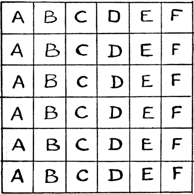האיור מייצג קופסה המכילה שלושים ושש קוביות אותיות. החידה היא לסדר מחדש את הקוביות כך שאף A לא יהיה בקו אנכי, אופקי או אלכסוני עם A אחר, אף B עם B אחר, אף C עם C אחר, וכן הלאה. תגלו שאי אפשר להכניס את כל האותיות לקופסה בתנאים אלה, אך העניין הוא למקם כמה שיותר. כמובן שאסור להשתמש באותיות אחרות מלבד אלה המוצגות.