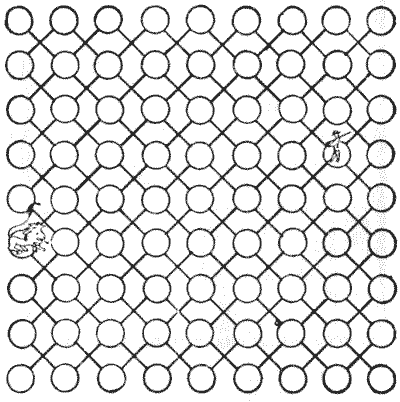 ובכן, הקפטן אומר שאם אריה נמרץ חוצה את דרכך במדבר, זה נהיה תוסס, כי האריה בדרך כלל חיפש את האדם בדיוק כמו שהאדם חיפש את מלך היער. ובכל זאת כשהם נפגשים הם תמיד רבים ונלחמים. קצת התבוננות בסכסוך המצער והמתמשך הזה בין שתי משפחות מכובדות הובילה אותי להבין כמה חישובים לגבי הסבירות שהאדם והאריה יחצו זה את דרכו של זה בג'ונגל. בכל המקרים הללו צריך להתחיל בהנחות מסוימות פחות או יותר שרירותיות. לכן באיור לעיל חשבתי לנכון לייצג את השבילים במדבר בסדר מופתי כזה. למרות שהקפטן מבטיח לי שעקבות האריות בדרך כלל רצים בדרך הזו, יש לי ספקות.