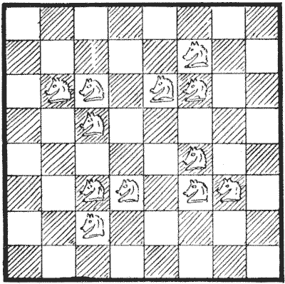 הראיתי בתרשים כיצד ניתן להציב שנים עשר אבירים (המספר הקטן ביותר האפשרי שיבצע את המשימה) על לוח השחמט כך שכל ריבוע יהיה או תפוס או מותקף על ידי אביר. בחן כל ריבוע בתורו, ותגלו שזה כך. כעת, החידה במקרה זה היא לגלות מהו המספר הקטן ביותר האפשרי של אבירים הנדרש כדי שכל ריבוע יהיה או תפוס או מותקף, וכל אביר מוגן על ידי אביר אחר. ואיך הייתם מסדרים אותם? יתברר שמתוך שנים עשר המוצגים בתרשים רק ארבעה מוגנים כך על ידי היותם במרחק מהלך של אביר מאביר אחר.