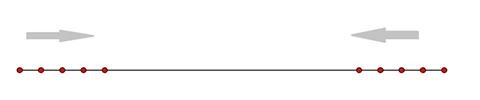 על מקל שאורכו מטר אחד יש `10` נמלים, `5` מכל צד, במרחקים של סנטימטר אחד (ראו ציור). הנמלים שבצד השמאלי של המקל הולכות ימינה, והנמלים שבצד הימני של המקל הולכות שמאלה. מהירות של כל נמלה קבועה ושווה לסנטימטר אחד בשנייה. כאשר שתי נמלים נפגשות, שתיהן הופכות כיוון ומתחילות להתרחק זו מזו. כאשר נמלה כלשהי מגיעה לקצה המקל, היא נופלת (נמלים הן יצורים מפגרים במיוחד).