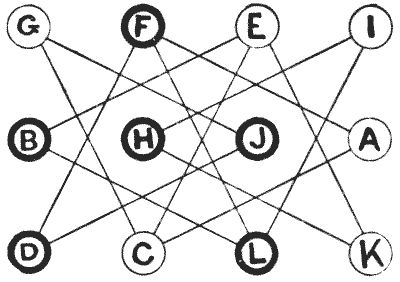 הנה חידה קטנה ומשעשעת עם העברת חיילים. אתה צריך רק שנים עשר חיילים—שישה מצבע אחד, המסומנים A, C, E, G, I ו-K, והשישה האחרים מסומנים B, D, F, H, J ו-L. אתה מניח אותם תחילה על הדיאגרמה, כפי שמוצג באיור, והחידה היא להביא אותם לסדר אלפביתי רגיל, כדלקמן:—