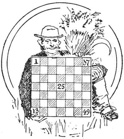 באחת השנים היה לו שדה מרובע גדול המחולק לארבעים ותשעה מגרשים מרובעים, כפי שמוצג באיור. הריבועים הלבנים נזרעו בחיטה והריבועים השחורים בשעורה. כשמגיע זמן הקציר הוא נתן הוראה שאנשיו יחתכו תחילה את התירס בחלקה המסומנת `1`, וכי כל חיתוך עוקב יהיה בדיוק מהלך פרש מהאחרון, החיתוך השלושה עשר יהיה בחלקה המסומנת `13`, העשרים וחמישי בחלקה המסומנת `25`, השלושים ושבעה בזו המסומנת `37`, והאחרון, או ארבעים ותשעה, בחלקה המסומנת `49`. זה היה יותר מדי עבור הודג' המסכן, ובכל יום החוואי לורנס היה צריך לרדת לשדה ולהראות על איזה חלק צריך להפעיל. אבל הבעיה אולי לא תציג קושי לקוראים שלי.