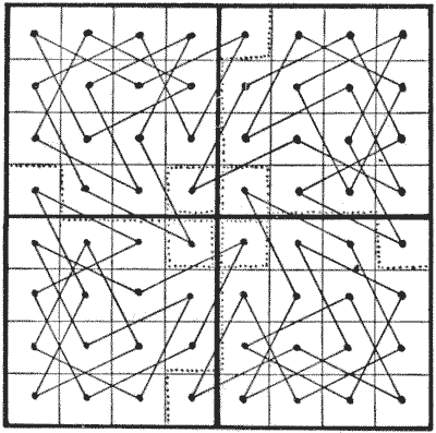 איננו יכולים לחלק את לוח השחמט הרגיל לארבעה תאים ריבועיים שווים, ולתאר מסע שלם, או אפילו מסלול, בכל תא. אבל אנחנו יכולים לחלק אותו לארבעה תאים, כפי שמוצג באיור, שניים המכילים כל אחד עשרים משבצות, ושניים האחרים מכילים כל אחד שתים עשרה משבצות, ובכך להשיג חידה מעניינת. אתם מתבקשים לתאר מסע חוזר ונכנס שלם על הלוח הזה, החל מאיפה שתרצו, אך לבקר בכל משבצת בכל תא עוקב לפני שעוברים לתא אחר, ולבצע את הקפיצה הסופית חזרה למשבצת ממנה יצא הפרש. זה לא קשה, אבל יתגלה כמבדר מאוד ולא חסר תועלת.