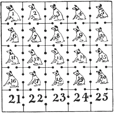 לאיש יש עשרים וחמש מכלאות כלבים, שכולן מתקשרות זו עם זו באמצעות פתחי דלתות, כפי שניתן לראות באיור. הוא מעוניין לסדר את עשרים הכלבים שלו כך שהם ייצרו מסלול פרש מכלב מספר `1` לכלב מספר `20`, כאשר השורה התחתונה של חמש המכלאות תישאר ריקה, כפי שהיא כעת. יש לעשות זאת על ידי העברת כלב אחד בכל פעם למכלאה פנויה. הכלבים מאומנים היטב לצייתנות, וניתן לסמוך עליהם שיישארו במכלאות שבהן הם ממוקמים, אלא אם כן שניים מהם ימוקמו באותה מכלאה יחד, הם יילחמו עד מוות. כיצד ניתן לפתור את החידה במספר המהלכים המועט ביותר האפשרי מבלי ששני כלבים יהיו יחד?