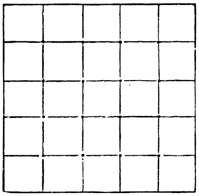 הבא מייצג חתיכת עץ ברשותי, `5` אינץ' מרובע. על ידי סימונים על פני השטח הוא מחולק לעשרים וחמישה אינצ'ים מרובעים. אני רוצה לגלות דרך לחתוך את חתיכת העץ הזו למספר המינימלי האפשרי של חלקים שיתאימו יחד וייצרו שני ריבועים מושלמים בגדלים שונים ובמידות ידועות. אבל, לצערי, בכל אחד משש עשרה הצמתים של קווי החיתוך נתקע מסמר קטן מתישהו, והמסור הנימי שלי ייפגע אם הוא יבוא במגע עם אחד מאלה. לכן אני צריך למצוא שיטה לעשות את העבודה שלא תחייב אותי לחתוך דרך אף אחת משש עשרה הנקודות האלה. איך זה אמור להיעשות? זכור, יש לתת את המידות המדויקות של שני הריבועים.