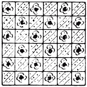 הדיאגרמה כאן מייצגת שני חלקי לינולאום נפרדים. דוגמת המשבצות לא חוזרת על עצמה בגב, כך שלא ניתן להפוך את החלקים. החידה היא לחתוך את שתי הריבועים לארבעה חלקים כך שהם יתאימו זה לזה וייצרו ריבוע מושלם אחד בגודל `10`×`10`, כך שהדוגמה תתאים כראוי, וכך שלחלק הגדול יותר יהיה חלק קטן ככל האפשר שנחתך ממנו.