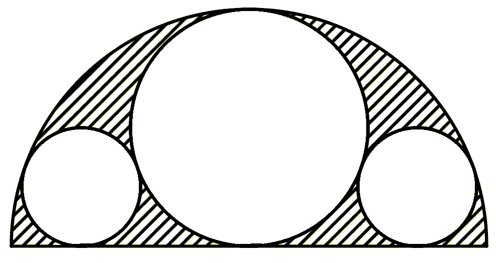 בציור חצי מעגל, שחסומים בתוכו שלושה מעגלים: המעגל הגדול, שמשיק לקוטר של חצי המעגל במרכזו, ושני מעגלים קטנים בצדדים, בצורה סימטרית. איזה שטח גדול יותר: השטח המקווקו או השטח הריק?