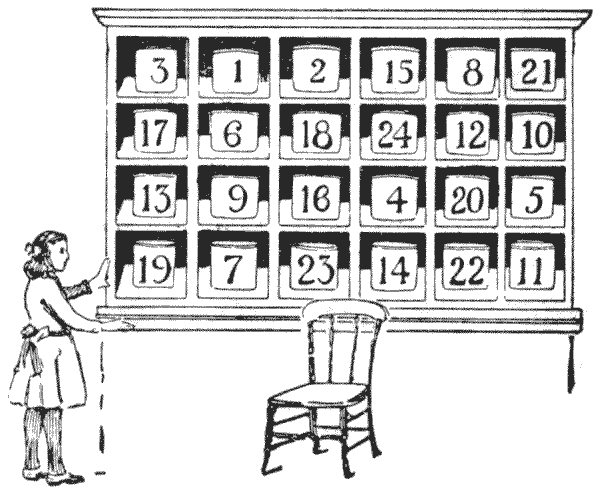 כפי שניתן לראות באיור, דורותי הקטנה צריכה לתפעל עשרים וארבע קופסאות ריבה גדולות במספר תאים תואם. היא רוצה לסדר אותן בסדר מספרי נכון—כלומר, `1, 2, 3, 4, 5, 6` על המדף העליון, `7, 8, 9, 10, 11, 12` על המדף הבא, וכן הלאה. עכשיו, אם היא תמיד לוקחת קופסה אחת ביד ימין ואחת ביד שמאל ומחליפה ביניהן, כמה מההחלפות האלה יהיו נחוצות כדי לסדר את כל קופסאות הריבה בסדר הנכון? באופן טבעי היא תחליף קודם את `1` ואת `3`, אחר כך את `2` ואת `3`, ואז יהיו לה שלוש הקופסאות הראשונות במקומן. איך היית מייעץ לה להמשיך מכאן? הניחו כמה אסימונים ממוספרים על דף נייר המחולק למשבצות עבור התאים, ותגלו שזו חידה משעשעת.