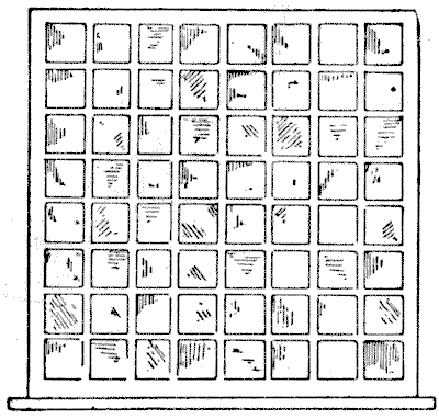 המלכה היא ללא ספק הכלי החזק ביותר על לוח השחמט. אם תניח אותה על אחד מארבעת הריבועים במרכז הלוח, היא תוקפת לא פחות מעשרים ושבעה ריבועים אחרים; ואם תנסה להחביא אותה בפינה, היא עדיין תתקוף עשרים ואחד ריבועים. ניתן להניח שמונה מלכות על הלוח כך שאף מלכה לא תתקוף מלכה אחרת, וזוהי חידה ותיקה (שהועלתה לראשונה על ידי נאוק ב-`1850`, ויש לה ספרות משלה) לגלות בכמה דרכים שונות ניתן לעשות זאת. אני מראה דרך אחת בתרשים, ויש בסך הכל שתים עשרה דרכים שונות במהותן. שנים עשר אלה מניבים תשעים ושתיים דרכים אם אנו רואים היפוכים ושיקופים כשונים. התרשים הוא במידה מסוימת סידור סימטרי. אם תהפוך את הדף, הוא ישחזר את עצמו בדיוק; אבל אם תסתכל עליו כשאחד הצדדים האחרים בתחתית, תקבל דרך אחרת שאינה זהה. ואז אם תשקף את שתי הדרכים האלה במראה, תקבל עוד שתי דרכים. כעת, כל אחד-עשר הפתרונות האחרים אינם סימטריים, ולכן ניתן להציג כל אחד מהם בשמונה דרכים על ידי היפוכים ושיקופים אלה. כך יובן מדוע שנים עשר הפתרונות השונים במהותם מניבים רק תשעים ושניים סידורים, כפי שאמרתי, ולא תשעים וששה, כפי שהיה קורה אילו כל שנים עשר לא היו סימטריים. כדאי שתהיה הבנה ברורה בעניין ההיפוכים והשיקופים כאשר עוסקים בחידות על לוח השחמט.
