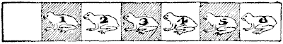 שש הצפרדעים המשכילות באיור אומנו להפוך את סדרן, כך שהמספרים שלהן יהיו `6, 5, 4, 3, 2, 1`, כאשר הריבוע הריק נמצא במיקומו הנוכחי. הן יכולות לקפוץ למשבצת הבאה (אם היא פנויה) או לדלג מעל צפרדע אחת למשבצת הבאה מעבר לה (אם היא פנויה), בדיוק כפי שאנו נעים במשחק הדמקה, ויכולות לנוע אחורה או קדימה כרצונן. האם תוכלו להראות כיצד הן מבצעות את המשימה שלהן במספר המהלכים המועט ביותר האפשרי? זה די קל, אז כשסיימתם הוסיפו צפרדע שביעית מימין ונסו שוב. לאחר מכן הוסיפו עוד צפרדעים עד שתוכלו לתת את הפתרון הקצר ביותר עבור כל מספר. כי זה תמיד אפשרי, עם המשבצת הריקה הבודדת הזו, לא משנה כמה צפרדעים יש.