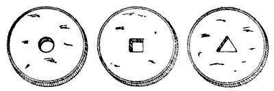 אלה מושחלים על חוטים כמו כפתורים. נניח שאחד עשר מטבעות עם חורים עגולים שווים חמישה עשר צ'ינג-צ'אנגים, שאחד עשר עם חורים מרובעים שווים שישה עשר צ'ינג-צ'אנגים, ושאחד עשר עם חורים משולשים שווים שבעה עשר צ'ינג-צ'אנגים, איך יכול סיני לתת לי עודף עבור חצי כתר, תוך שימוש רק במטבעות משלושת הסוגים שהוזכרו? צ'ינג-צ'אנג אחד שווה בדיוק שני פני וארבע חלקי חמש עשרה מצ'ינג-צ'אנג.