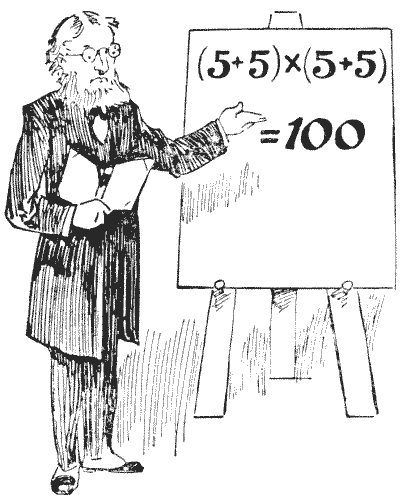 באיור נראה פרופסור ראקבריין מדגים אחד מהתחבולות הקטנות שבהן הוא רגיל לבדר את הכיתה שלו. הוא מאמין שעל ידי הוצאת תלמידיו ממסלולים שחוקים הוא מסוגל יותר להבטיח את תשומת ליבם, ולגרום לשיטות חשיבה מקוריות ומתוחכמות. כפי שנראה, הוא בדיוק הראה כיצד ניתן לכתוב ארבע פעמים `5` עם סימנים אריתמטיים פשוטים כך שיצייגו `100`. כל קורא צעיר יראה במבט חטוף שהדוגמה שלו נכונה לחלוטין. עכשיו, מה שהוא רוצה שתעשו זה: סדרו ארבע פעמים `7` (לא יותר ולא פחות) עם סימנים אריתמטיים כך שהם ייצגו `100`. אם הוא היה אומר שעלינו להשתמש בארבע פעמים `9`, מיד היינו יכולים לכתוב `99 9/9`, אבל ארבע פעמים `7` דורשות קצת יותר תושייה. האם תוכלו לגלות את הטריק הקטן? -